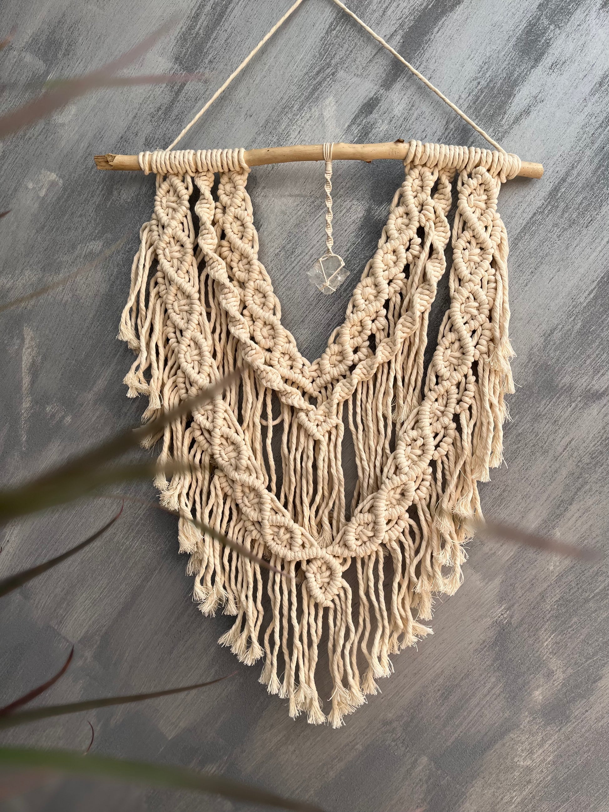 Tako jednostavna a tako posebna ova zidna makrame dekoracija sa dodatkom gorskog kristala će u vaš prostor uneti boho momenat. Ovakav komad je unikat i neće se ponovo raditi.
