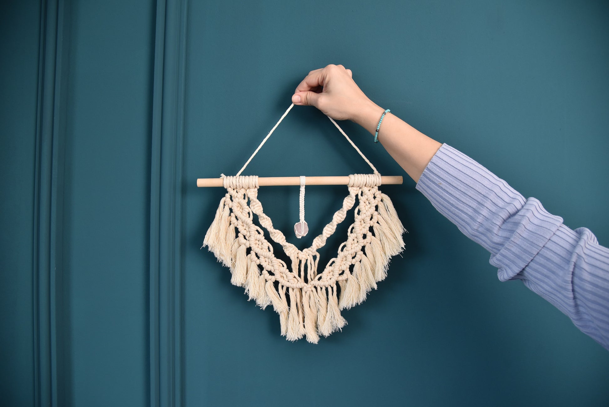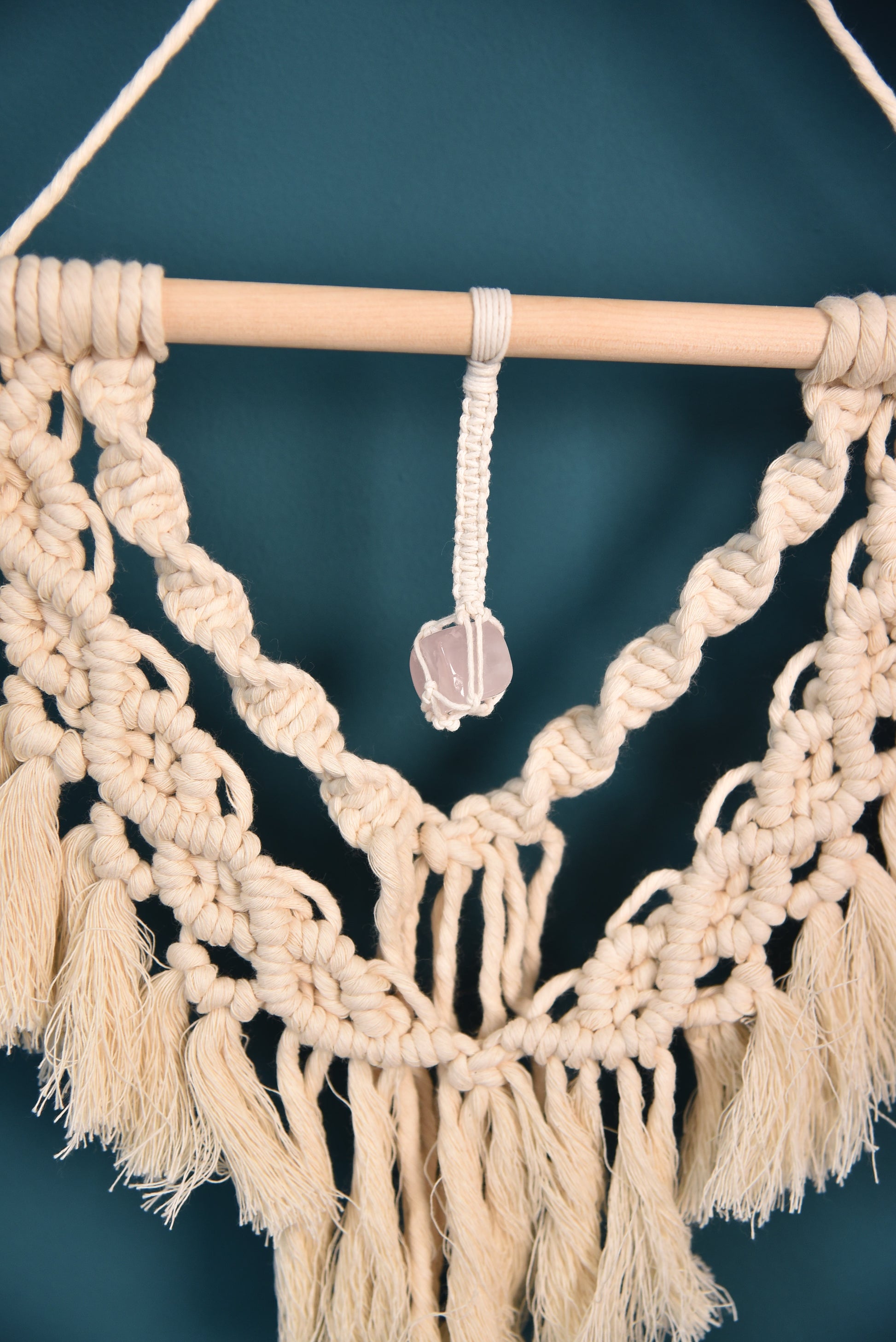 Manja zidna dekoracija sa Rozenkvarcom je savršen primer kombinacije prirodnih materijala, elegancije i boho dizajna.